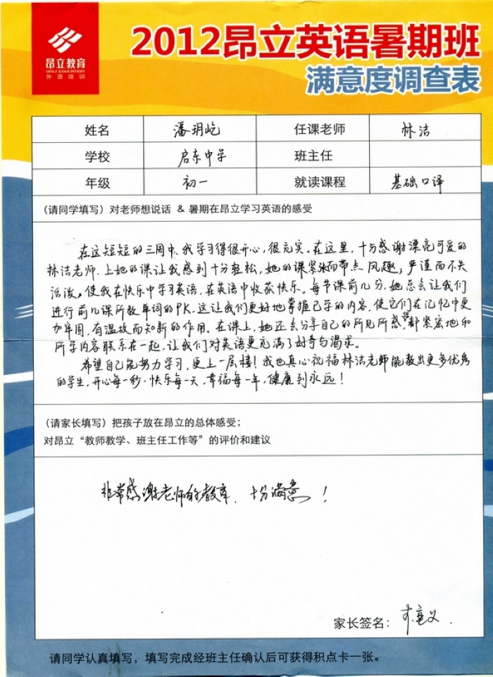 昂立教育 > 項目總攬 > 基礎口譯 > 學習體會 > 2012昂立英語暑假班滿意度反饋表-潘玥屹