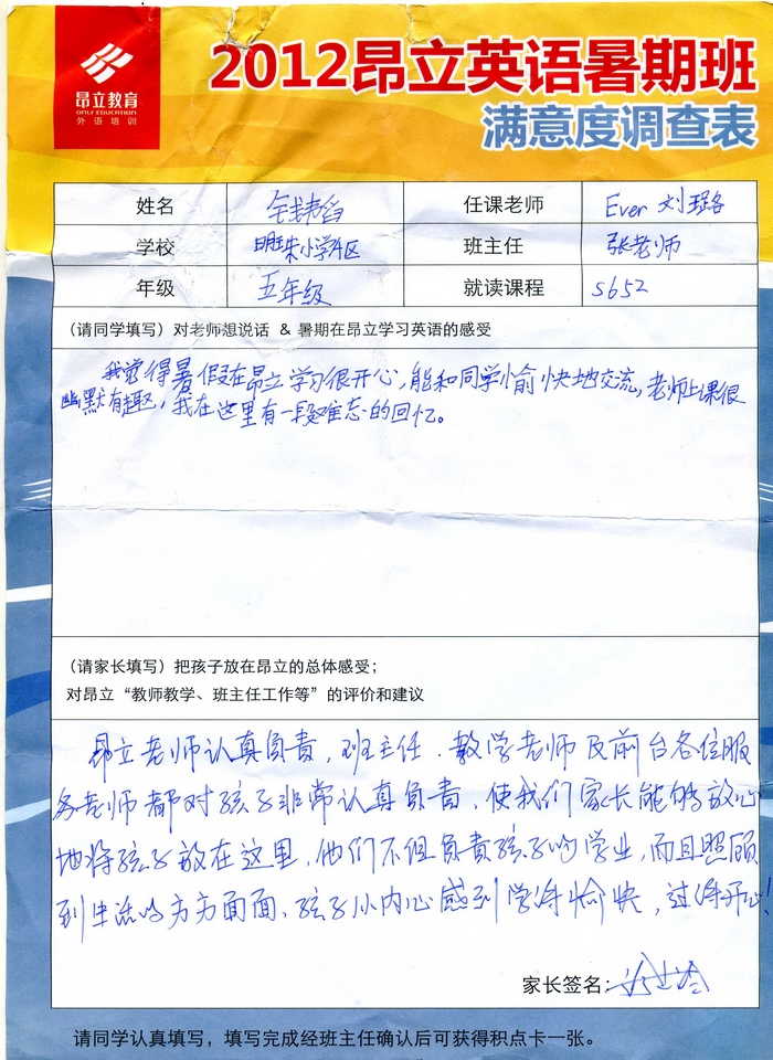 昂立教育 > 項目總攬 > 基礎口譯 > 學習體會 > 2012昂立英語暑假班滿意度反饋表-錢韜