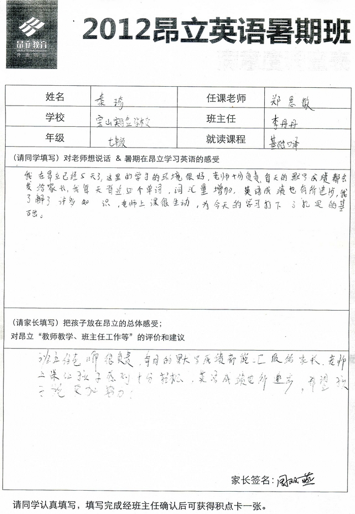 2012昂立英語暑假班滿意度反饋表-秦琦