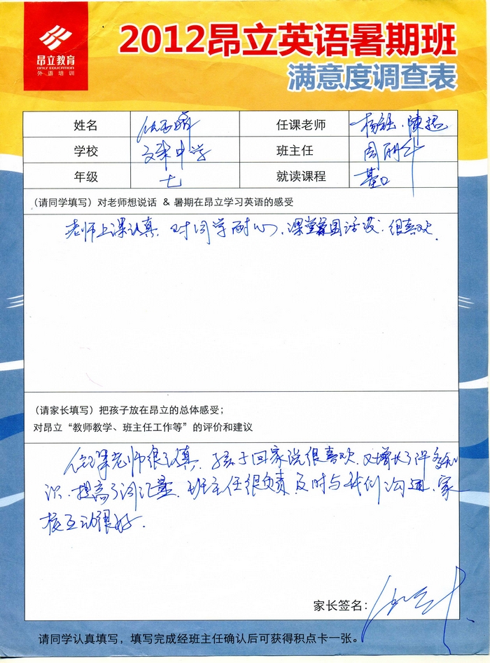 昂立教育 > 項目總攬 > 基礎口譯 > 學習體會 > 2012昂立英語暑假班滿意度反饋表-任雨晴
