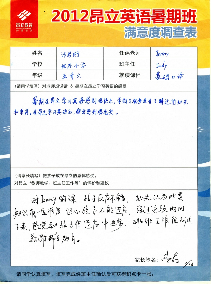 昂立教育 > 項目總攬 > 基礎口譯 > 學習體會 > 2012昂立英語暑假班滿意度反饋表-沙若珩
