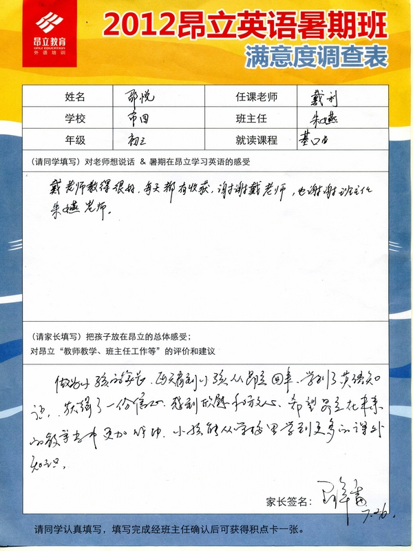 2012昂立英語暑假班滿意度反饋表-邵悅