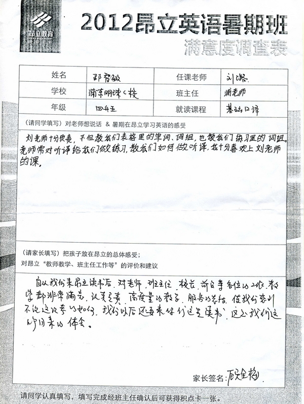 昂立教育 > 項目總攬 > 基礎口譯 > 學習體會 > 2012昂立英語暑假班滿意度反饋表-邵智敏
