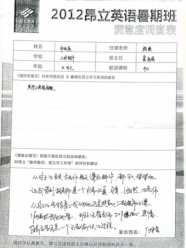 昂立教育 > 項目總攬 > 基礎口譯 > 學習體會 > 2012昂立英語暑假班滿意度反饋表-申浩辰