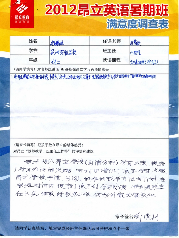 昂立教育 > 項目總攬 > 基礎口譯 > 學習體會 > 2012昂立英語暑假班滿意度反饋表-沈鵬辰