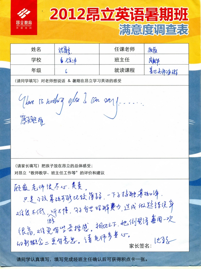 昂立教育 > 項目總攬 > 基礎口譯 > 學習體會 > 2012昂立英語暑假班滿意度反饋表-沈倩雯
