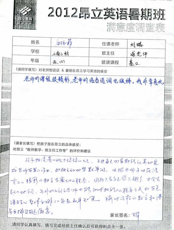 昂立教育 > 項目總攬 > 基礎口譯 > 學習體會 > 2012昂立英語暑假班滿意度反饋表-唐依菲