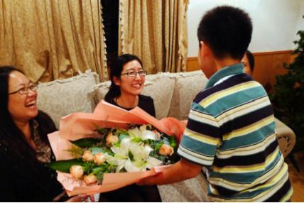王嘉驥同學向楊鈺老師鮮花感謝老師的細心培養