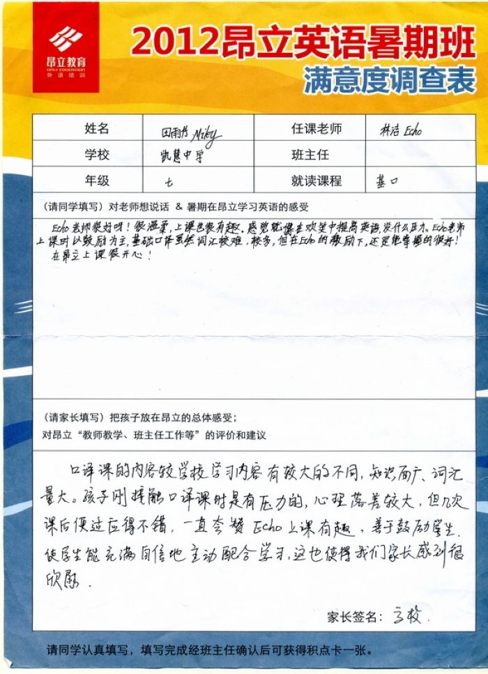 昂立教育 > 項目總攬 > 基礎口譯 > 學習體會 > 2012昂立英語暑假班滿意度反饋表-田雨竹