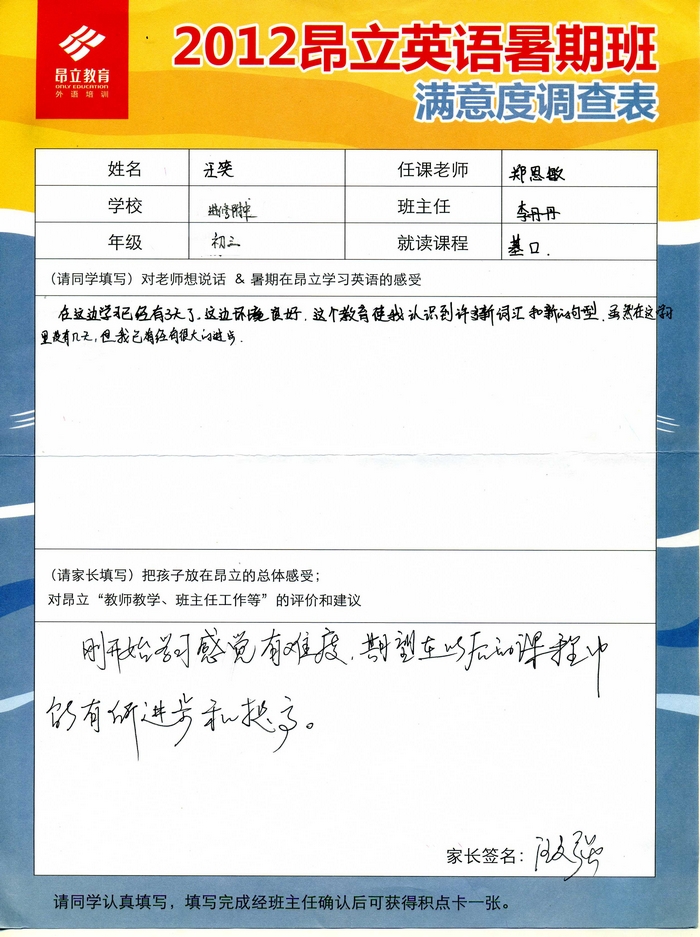昂立教育 > 項目總攬 > 基礎口譯 > 學習體會 > 2012昂立英語暑假班滿意度反饋表-汪笑