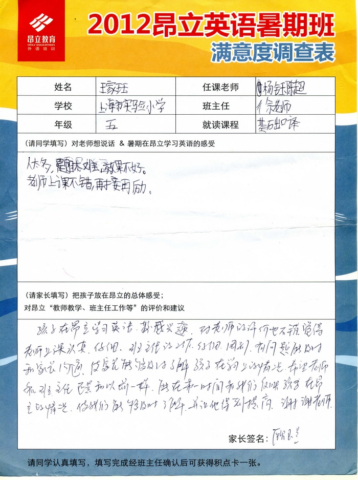 昂立教育 > 項目總攬 > 基礎口譯 > 學習體會 > 2012昂立英語暑假班滿意度反饋表-王家玨