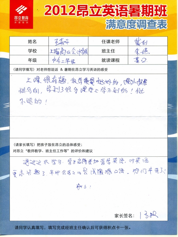 昂立教育 > 項目總攬 > 基礎口譯 > 學習體會 > 2012昂立英語暑假班滿意度反饋表-王嘉卉