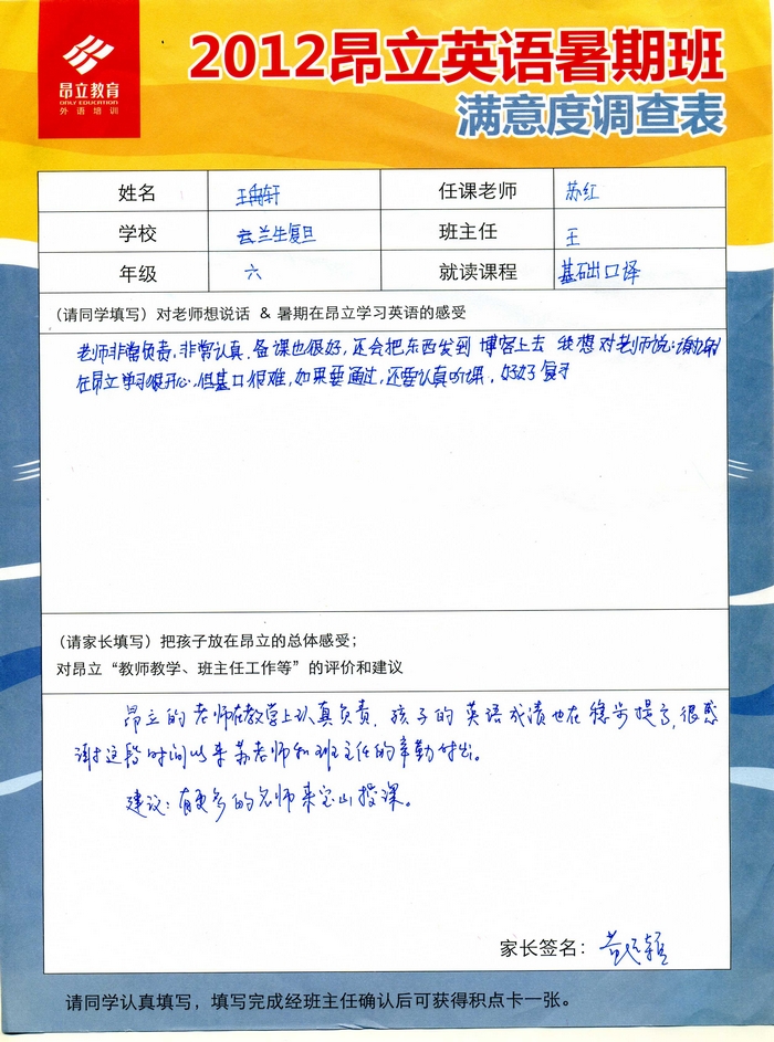 昂立教育 > 項目總攬 > 基礎口譯 > 學習體會 > 2012昂立英語暑假班滿意度反饋表-王禹軒