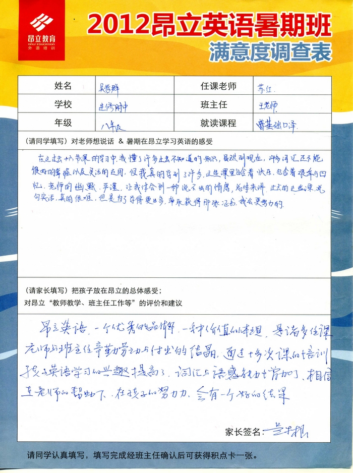 昂立教育 > 項目總攬 > 基礎口譯 > 學習體會 > 2012昂立英語暑假班滿意度反饋表-吳哲群