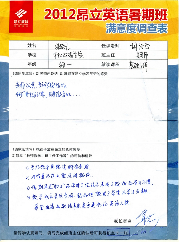 昂立教育 > 項目總攬 > 基礎口譯 > 學習體會 > 2012昂立英語暑假班滿意度反饋表-徐軼凡