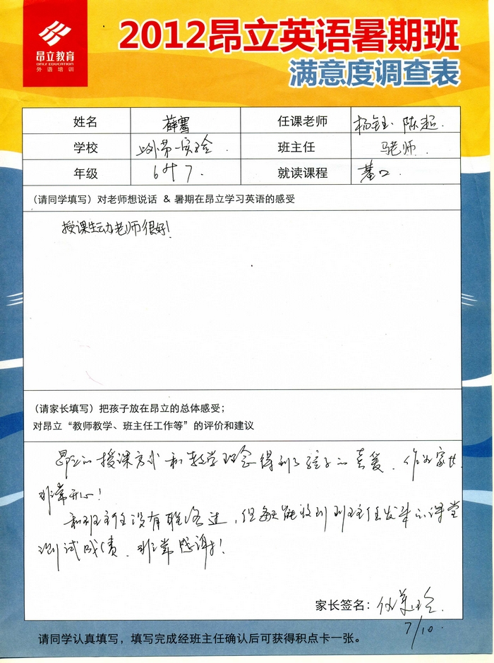2012昂立英語暑假班滿意度反饋表-薛騫