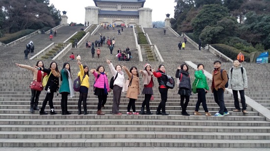 中山先生這一生愈挫愈勇、輝煌壯烈、萬眾敬仰、十分傳奇。當我們睡眼朦朧地走出賓館,看到天空飄著可恨的蒙蒙細雨,于是萬分自然地擁有了沉重的心情,特別適合去瞻仰中山先生的陵寢。到達之后,我們一邊感受著那大氣的布局和莊嚴的氣勢,一邊向中山陵的最高處攀登。途中不忘在各臺階適合拍照處留下歡騰的合影,大家配合地擺出了各種逗比姿勢,惹得旁邊的游客駐足觀看、爭相效仿。