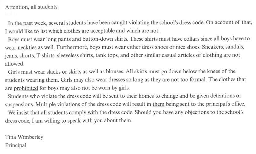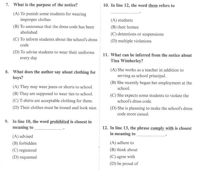 Key: 7 C 文章開頭“I would like to list which clothes are acceptable and which are not. ”可知這則通知的主旨。 8 B 從第二段:These shirts must have collars since all boys have to wear neckties as well. neckties:領結。 9 B prohibited=forbidden 禁止的 10 A 11C 這是一篇關于punishments for students who violate the school's dress code的文章,所以可以推斷Tina Wimberley預計學生會違反學校的著裝規定。 12 A comply with=follow=adhere to vocabulary: violate: 違反 dress code: 著裝規定 on account of : 由于,基于 button-down shirts:有紐扣的襯衫 neckties: 領結 sleeveless shirts: 無袖襯衫 tank tops: 背心 slacks:寬松長褲 prohibit: 禁止 detention: 放學后留校 result in : 導致,造成 comply with: 遵守 objection: 異議