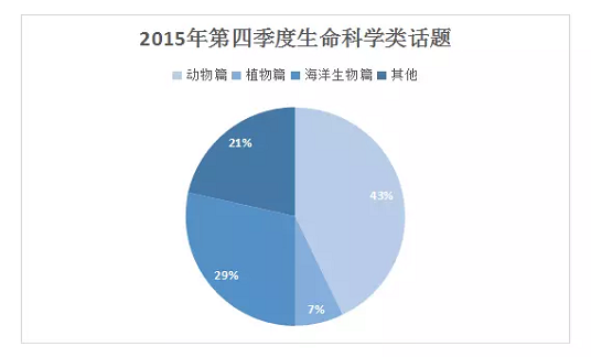 具體來看,生命科學類話題為14篇。其中動物篇話題有8篇聽力材料,植物1篇,海洋生物4篇,其他話題為3篇,分別為細菌對人體的益處;卵和藻類的共生關系以及利用植物創新殺蟲劑。這個數據一方面說明話題主要集中在比較傳統的動物學領域上,另外看到其他類的三篇文章,我們也會發現微生物領域也在逐漸加入生命科學話題的行列。