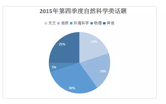 篇目最多的20篇自然科學類話題中,我們發現分別為6篇環境科學,地質天文均為4篇,1篇物理學以及5篇其他分類,主要是化學和生態學。需要注意的是,在本季度5篇其他自然科學類話題中“屋頂花園”這篇文章也是出現在11月14日和12月20日兩次考題中,希望考生要加重對本話題的關注,更是要對于化學和生態學這兩項分類的題目有所涉獵,以防考試時出現漏洞。