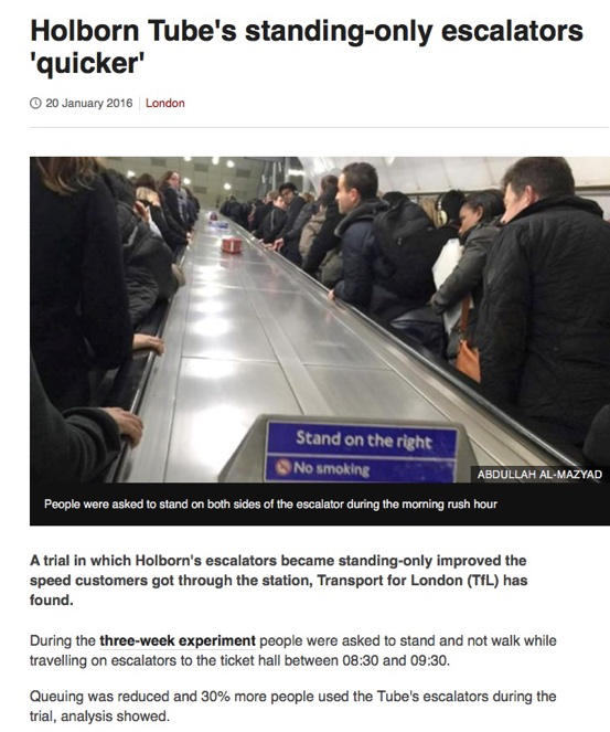 A three-week trial at Holborn last year found that the number of people using escalators at any one time could be raised by almost a third. Peter McNaught, operations director at London Underground, said: “It may not seem right that you can go quicker by standing still, but our experiments at Holborn have proved that it can be true. This new six-month trial will help us find out if we can influence customers to stand on both sides in the long term.”